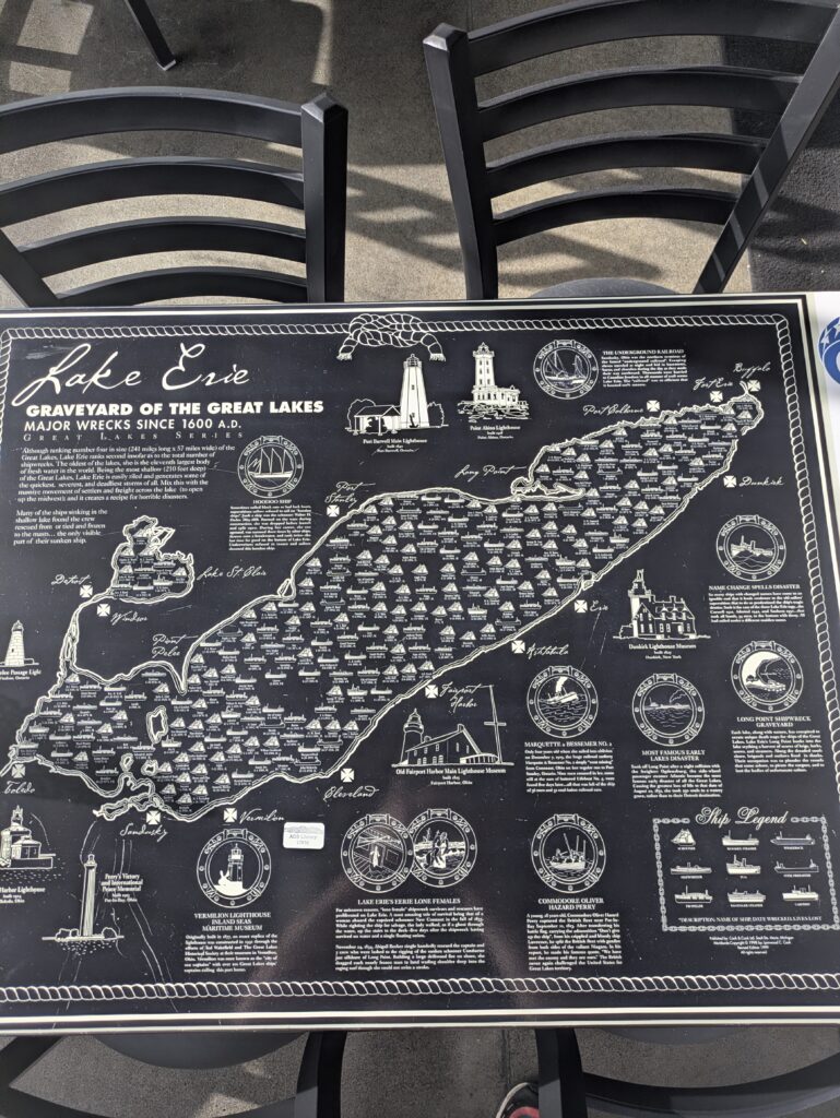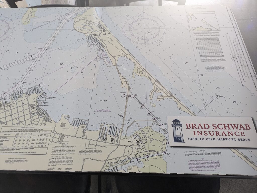 A standout feature for customers is the nautical theme. Every table includes a detailed map or navigation chart, including Lake Erie shipwreck routes and coastal charts, giving visitors something to explore while they eat. The walls feature additional local artwork, including a Vermilion map and lighthouse imagery.