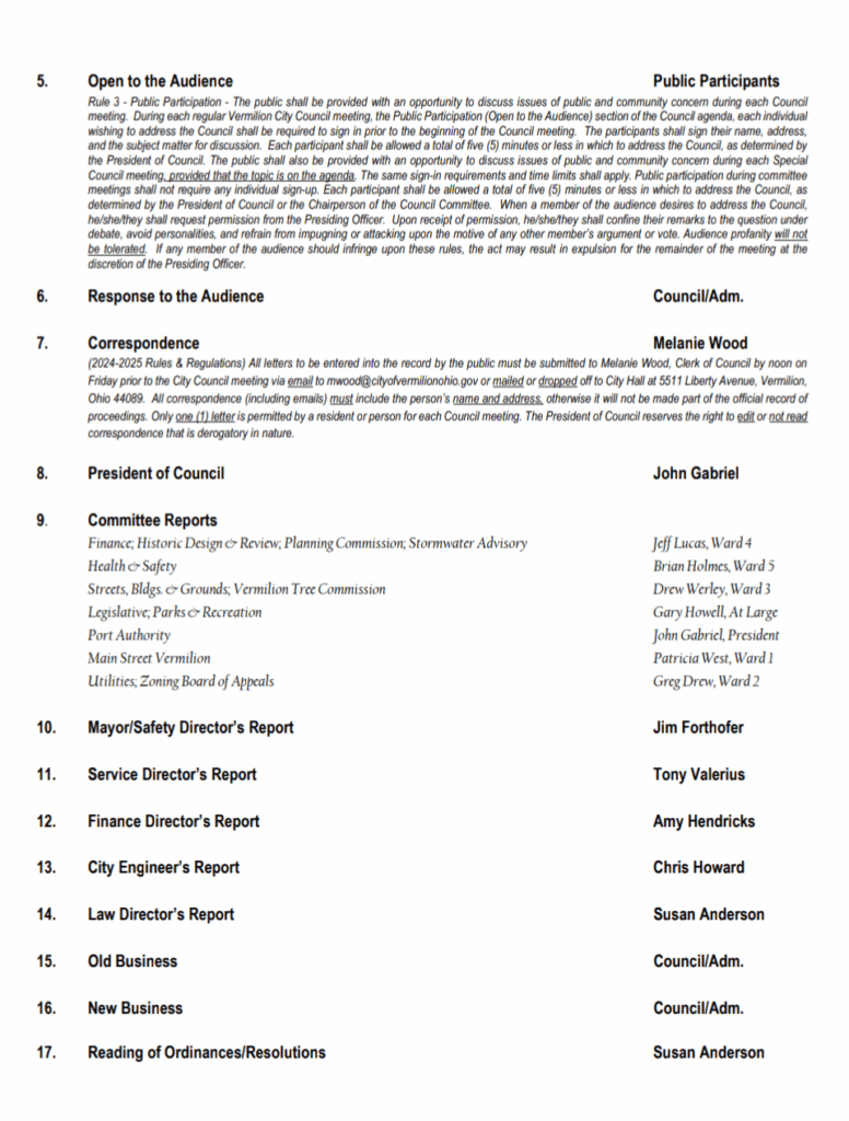 Council will meet again October 6 at 6 p.m. at the Vermilion Municipal Court Complex, with committee meetings scheduled for October 20 and a regular meeting October 27.
