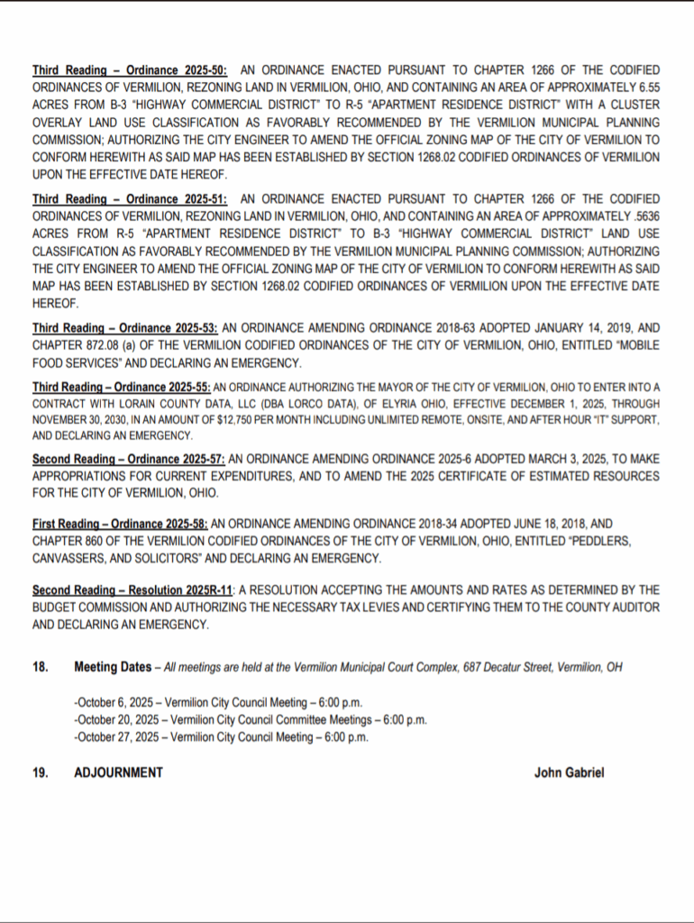 - 2025-51: Rezoning behind the martial arts studio on Vermilion Road, approved unanimously after public hearing.