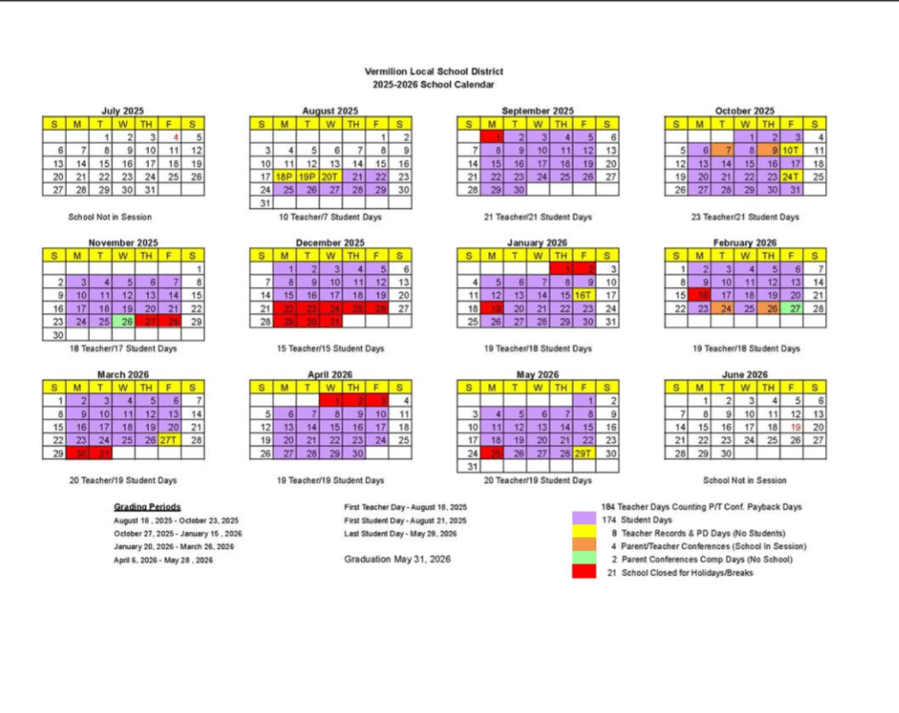 The Vermilion Local School District will welcome students in grades 1–12 back to class on Thursday, August 21, 2025. The district has released the full 2025–2026 school calendar and detailed back-to-school schedules for Vermilion Elementary, Sailorway Middle, and Vermilion High School.